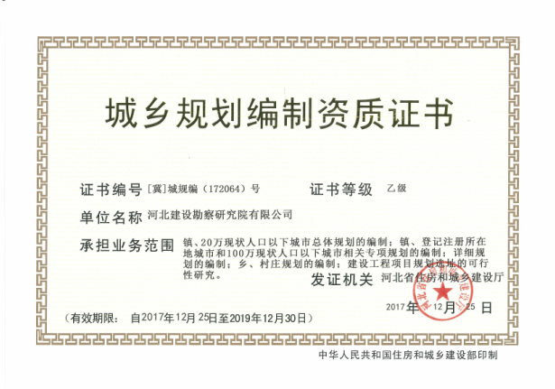 經(jīng)過(guò)艱苦努力,我公司于2017年12月25日取得了城鄉(xiāng)規(guī)劃編制乙級(jí)資質(zhì)證書(shū),可承擔(dān)20萬(wàn)現(xiàn)狀人口以下城市總體規(guī)劃的編制,登記注冊(cè)所在地城市和100萬(wàn)現(xiàn)狀人口以下城市相關(guān)專(zhuān)項(xiàng)規(guī)劃的編制,以及建設(shè)工程項(xiàng)目規(guī)劃選址的可行性研究。