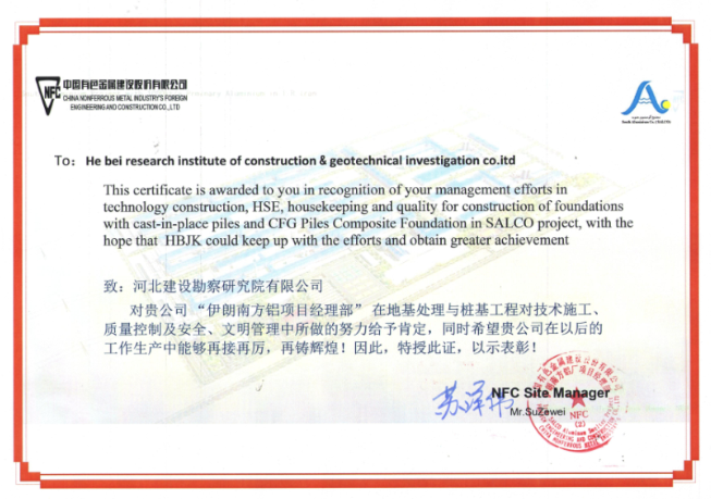 我公司承建的伊朗南方鋁項目,自開工以來精心策劃、有效組織、認真施工、積極與業(yè)主配合,保質(zhì)保量完成了施工進度。在施工過程中業(yè)主對我公司伊朗南方鋁項目部在技術(shù)施工、質(zhì)量控制及安全、文明管理中所做的努力給予了肯定,并授予表彰證書。