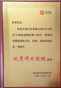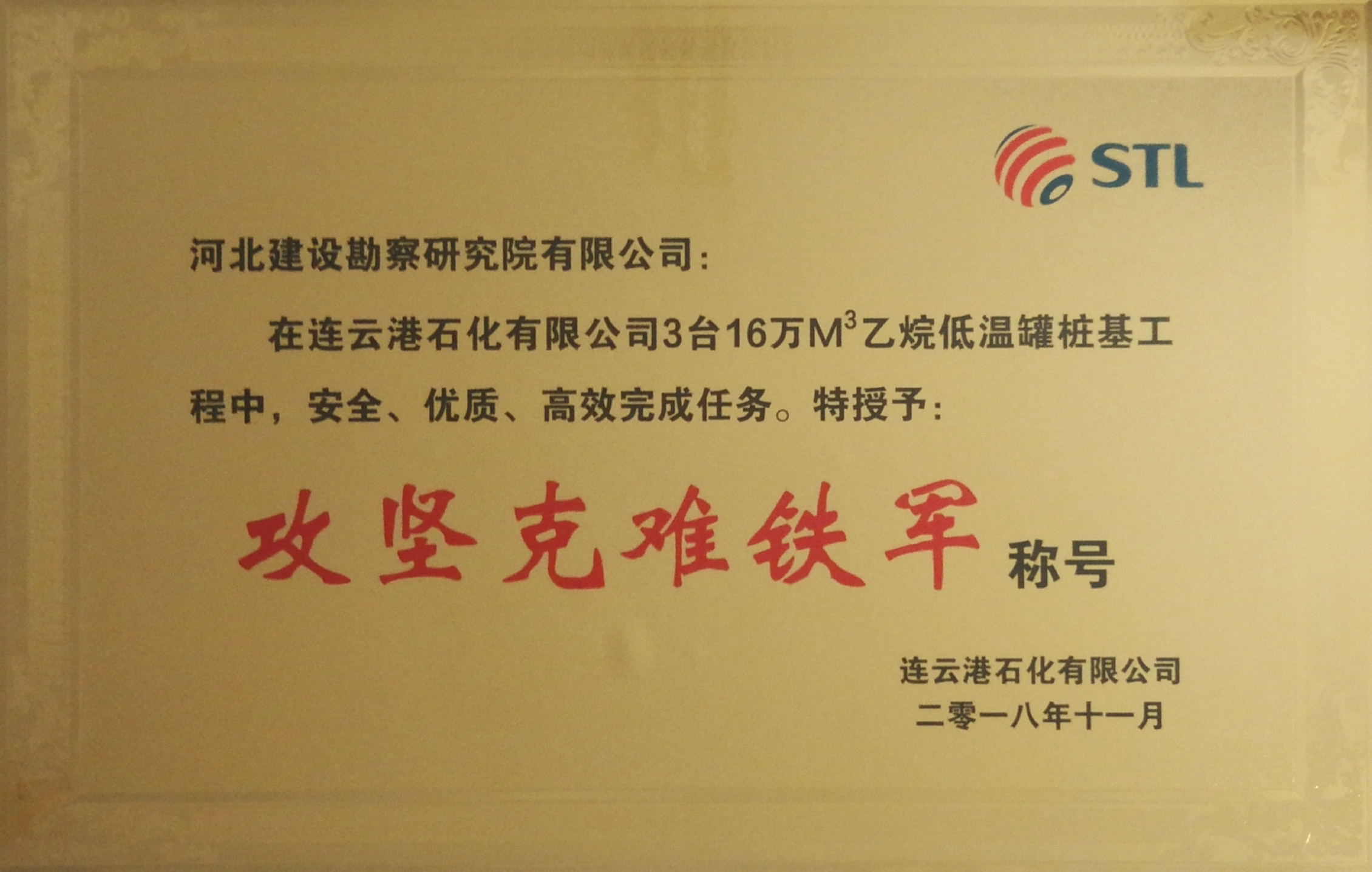 2018年12月14日連云港石化有限公司副總經(jīng)理孫剛特向我公司李友東經(jīng)理親自頒發(fā)“攻堅(jiān)克難鐵軍”稱號(hào)獎(jiǎng)牌,向項(xiàng)目經(jīng)理李亮同志頒發(fā)“優(yōu)秀項(xiàng)目經(jīng)理”榮譽(yù)稱號(hào),并致感謝信,對(duì)我公司表現(xiàn)出來無私奉獻(xiàn)、頑強(qiáng)拼搏的精神給予了高度肯定。河北建勘“鐵軍”風(fēng)采、勇創(chuàng)第一的精神,獲得了業(yè)主及各方一致贊譽(yù),并衷心希望我們雙方在今后的工作中精誠合作,共鑄輝煌!