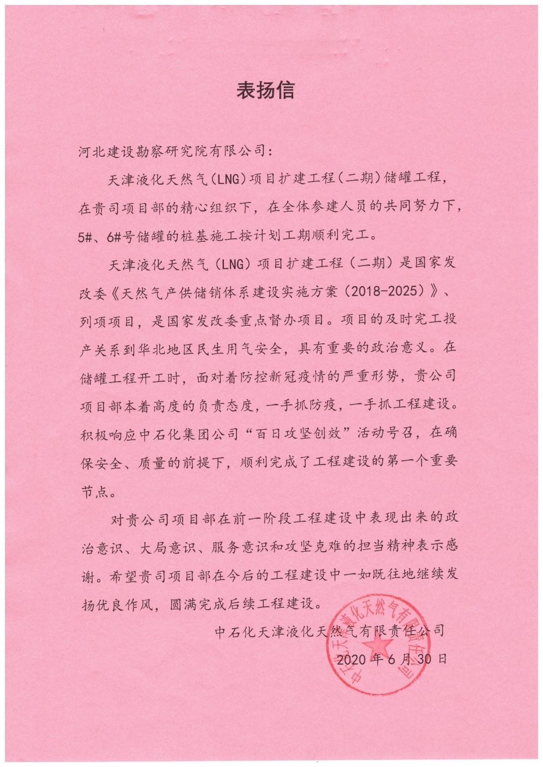 公司承建的天津液化天然氣(LNG)項(xiàng)目擴(kuò)建工程(二期)5#6#罐樁基工程,自2020年4月5日正式開工,歷經(jīng)83個(gè)日夜的奮戰(zhàn),最終于2020年6月26日優(yōu)質(zhì)、高效、圓滿的完成了5#6#罐的樁基施工任務(wù)。中石化天津液化天然氣有限責(zé)任公司,對我公司中石化天津LNG二期項(xiàng)目部提出表揚(yáng),表揚(yáng)我公司領(lǐng)導(dǎo)及全體項(xiàng)目施工人員對項(xiàng)目高度負(fù)責(zé)的態(tài)度,一手抓防疫,一手抓工程建設(shè),積極響應(yīng)中石化集團(tuán)公司“百日攻堅(jiān)創(chuàng)效”活動(dòng)號召,在確保安全、質(zhì)量的前提下,順利完成了工程建設(shè)的第一個(gè)重要節(jié)點(diǎn)。同時(shí)對我公司在前一階段工程建設(shè)中表現(xiàn)出來的政治意識、大局意識、服務(wù)意識和攻堅(jiān)克難的擔(dān)當(dāng)精神表示感謝。希望我公司在今后的工程建設(shè)中一如既往地繼續(xù)發(fā)揚(yáng)優(yōu)良作風(fēng),圓滿完成后續(xù)工程建設(shè)。
