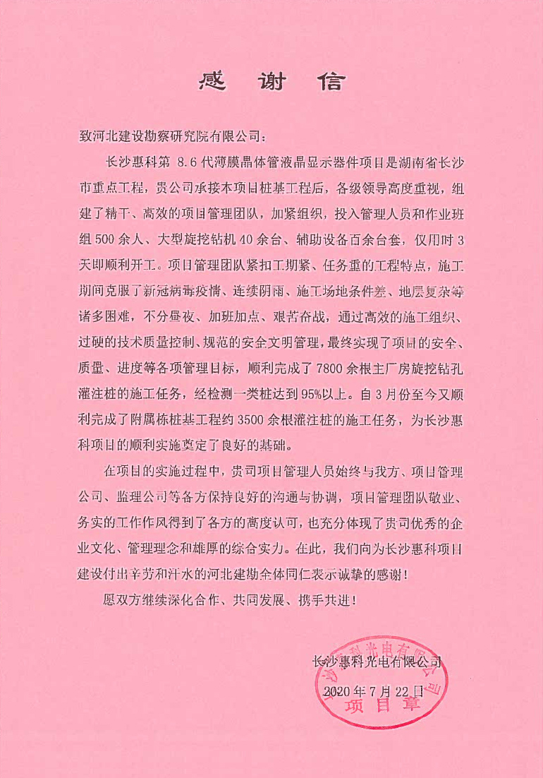 公司承建的長沙惠科光電有限公司長沙惠科第8.6代超高清新型顯示器件生產線項目樁基工程,近日收到業(yè)主長沙惠科光電有限公司的感謝信。感謝信中對我公司項目管理團隊敬業(yè)、務實的工作作風,以及安全、質量管理工作給予了高度的肯定和認可。向為長沙惠科項目建設付出辛勞和汗水的河北建勘全體同仁表示誠摯的感謝!愿雙方繼續(xù)深化合作、共同發(fā)展、攜手共進!