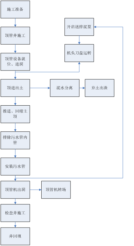 作為本次工程項目運用泥水平衡頂管機(jī)的施工技術(shù)工藝流程圖,前期準(zhǔn)備、工作井、接收井施工、設(shè)備就位、安裝止水膠圈、進(jìn)洞、頂進(jìn)出土、分離泥水、回縮主頂、安裝頂管、頂管機(jī)出洞轉(zhuǎn)場,進(jìn)行檢查井施工后回填。