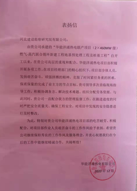 華能洋浦熱電聯(lián)產(chǎn)項目(2×460MW級)燃氣-蒸汽聯(lián)合循環(huán)新建工程地基預處理工程及樁基工程自開工以來,積極開展各項工作,精心組織,克服了時間緊任務重的困難,保質(zhì)保量完成了節(jié)點目標。特對項目部的吃苦耐勞、積極配合,對項目部作業(yè)人員艱苦奮斗的工作作風給予表揚。