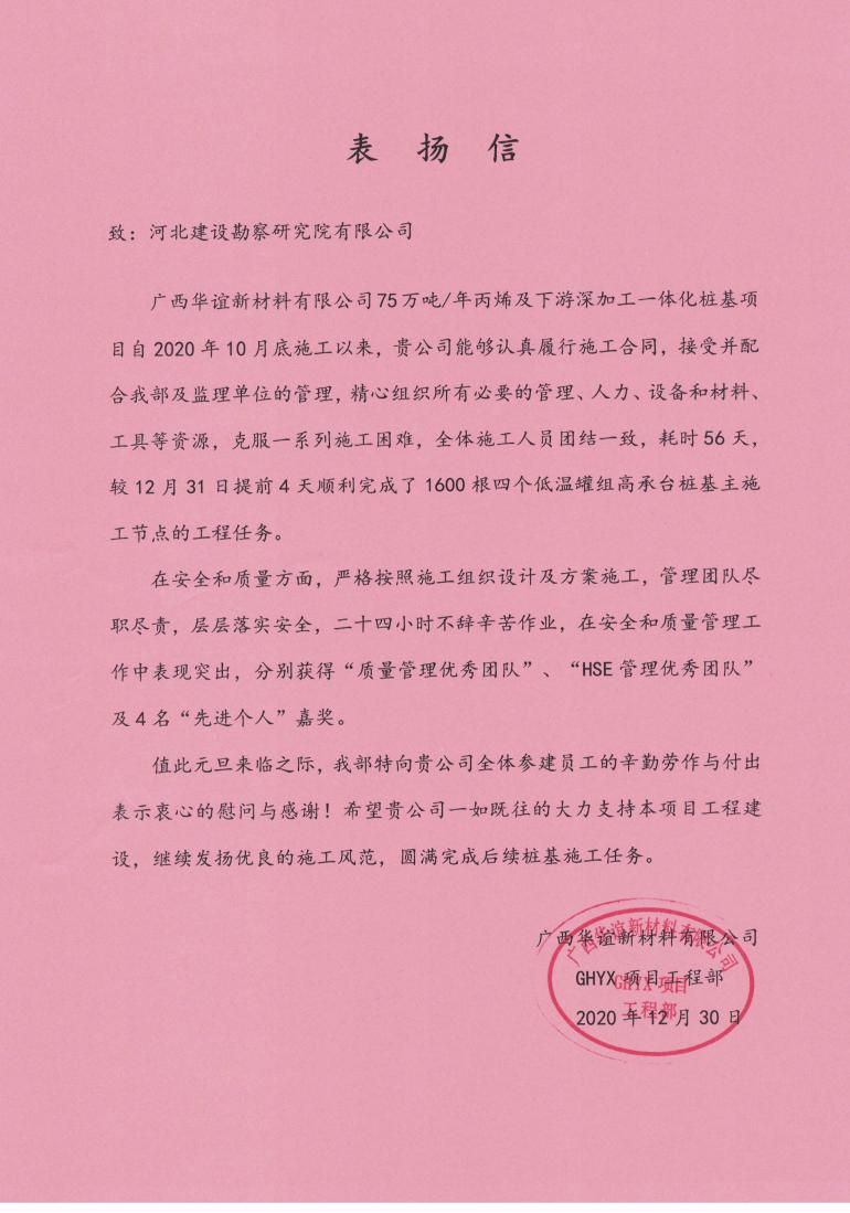 廣西華誼新材料有限公司75萬噸/年丙烯及下游深加工一體化樁基項目部,近日收到來自甲方的表揚信及嘉獎。