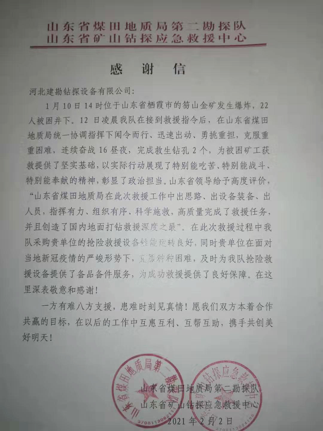 2月2日,公司收到山東省煤田地質(zhì)局第二勘探隊、山東省礦山鉆探應(yīng)急救援中心發(fā)來的感謝信。