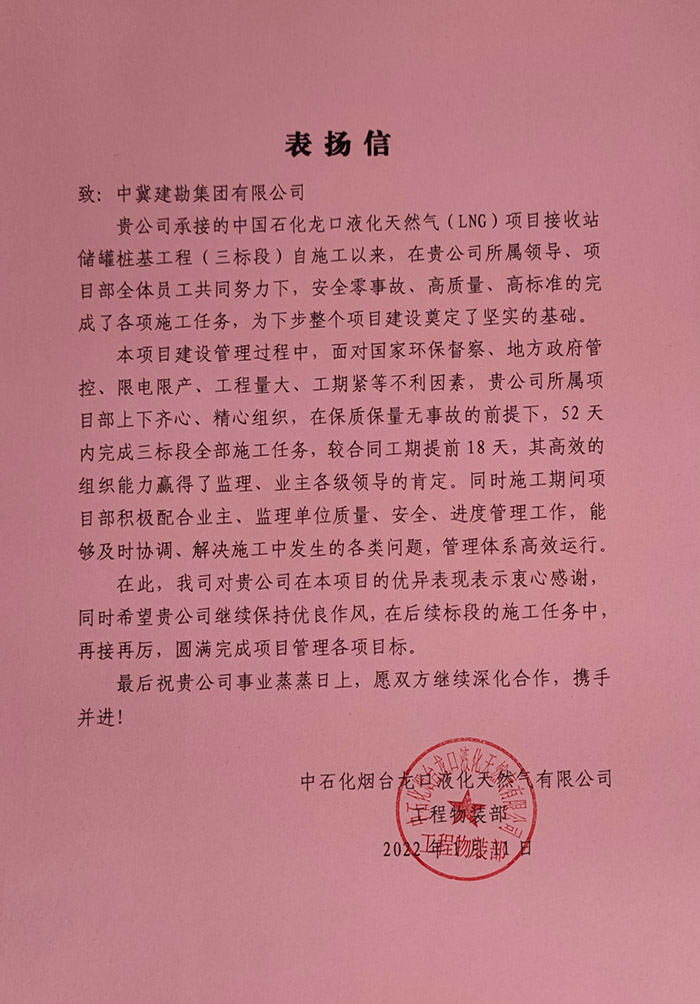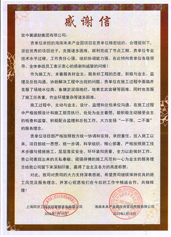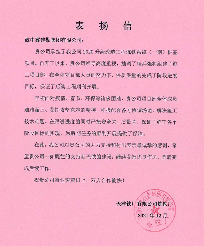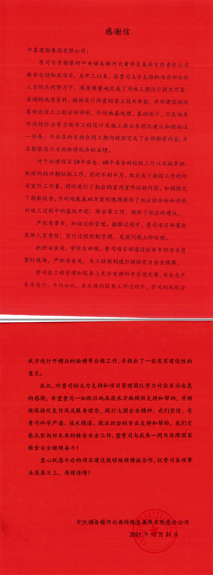 天津鐵廠有限公司煉鐵廠對我公司在疫情期間為確保項(xiàng)目目標(biāo)迎難而上、攻堅(jiān)克難的精神表示贊賞,對我公司一如既往的支持和客戶至上的理念表示感謝。中儲糧河北黃驊直屬庫有限公司對我公司的勘察報(bào)告、后續(xù)驗(yàn)收服務(wù)表示贊許,對公司提供的科學(xué)嚴(yán)謹(jǐn)、技術(shù)精湛、敬業(yè)擔(dān)當(dāng)?shù)膶I(yè)支持和幫助表示感謝。
