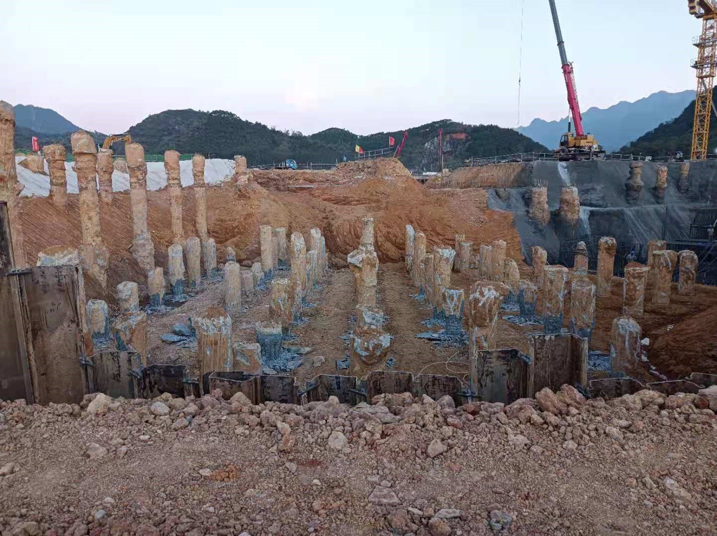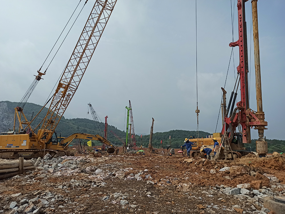 本工程于2021年04月10日開工,2022年01月27日現(xiàn)場樁基施工完工,工程施工期間累計(jì)投入施工人員200余人和大功率旋挖鉆機(jī)10臺(tái)以及相關(guān)匹配的機(jī)械設(shè)備??朔擞昙尽⒏邷睾偷刭|(zhì)條件復(fù)雜等諸多不利因素,累計(jì)完成鉆孔灌注樁1857根,處理溶洞約31000m³(含回填片石、水泥、C20砼及注漿和遇溶洞樁超灌混土量)。