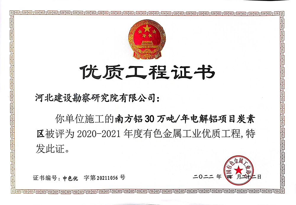 由我單位施工的南方鋁30萬噸/年電解鋁項目碳素區(qū)被評為2020—2021年度有色金屬工業(yè)優(yōu)質工程獎。