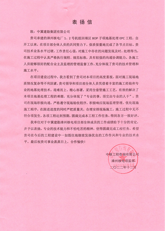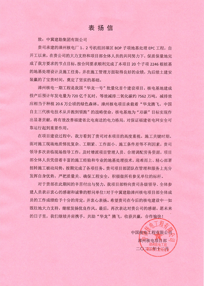 漳州核電一期工程是我國“華龍一號(hào)”批量化首個(gè)建設(shè)項(xiàng)目,承載著“華龍騰飛,中國自主三代核電技術(shù)從并跑到領(lǐng)跑”的戰(zhàn)略使命,核電基地為“雙碳”目標(biāo)實(shí)現(xiàn)作出顯著貢獻(xiàn),是國家核電建設(shè)的重點(diǎn)項(xiàng)目。在工程建設(shè)過程中面對(duì)規(guī)模較大、場(chǎng)地分散、交叉施工等多項(xiàng)不利因素,項(xiàng)目部迎難而上、精心部署、晝夜施工,確保安全、質(zhì)量的情況下按期完成了各項(xiàng)任務(wù)。項(xiàng)目部在谷習(xí)光同志的帶領(lǐng)下,在管理和服務(wù)上充分發(fā)揮自身優(yōu)勢(shì),積極爭(zhēng)當(dāng)所有參見單位的標(biāo)桿,得到了甲方和監(jiān)理的高度贊揚(yáng),為以后更多的合作奠定了堅(jiān)實(shí)基礎(chǔ)。
