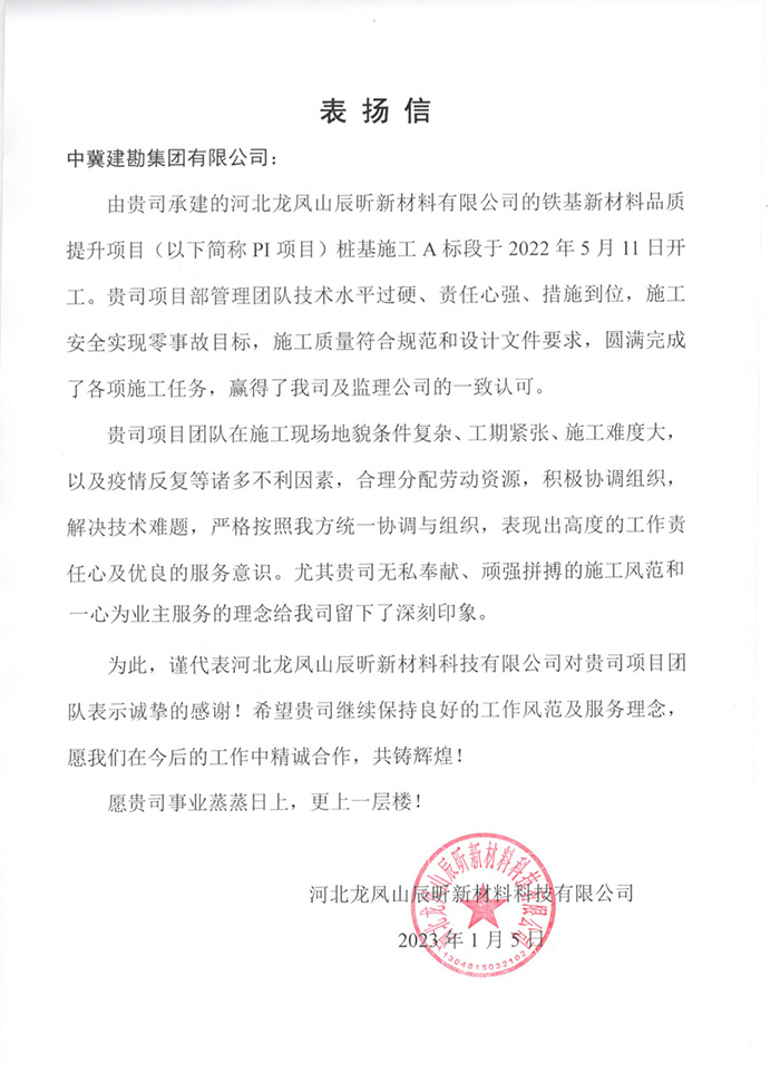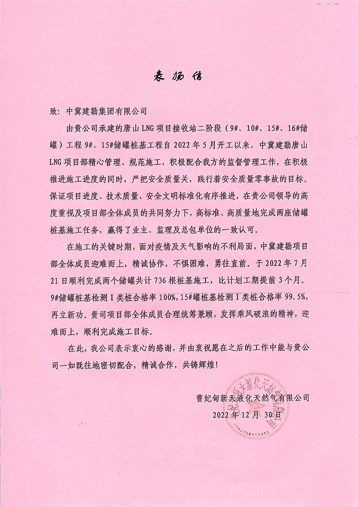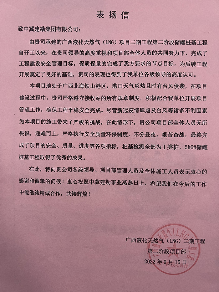 2022年12月30日我公司收到業(yè)主曹妃甸新天液化天然氣有限公司發(fā)來的表揚(yáng)信。由我公司承建的唐山LNG項(xiàng)目接收站二階段(9#、10#、15#、16#儲(chǔ)罐)工程9#、15#儲(chǔ)罐樁基工程,主要施工內(nèi)容為736根樁徑1.4m、樁長71m/74m混凝土灌注樁,本項(xiàng)目自2022年5月31日開工以來,在唐山LNG項(xiàng)目部精心管理、規(guī)范施工下,嚴(yán)把安全質(zhì)量關(guān),踐行著安全質(zhì)量零事故目標(biāo),于2022年7月21日順利完成所有施工任務(wù),贏得業(yè)主、監(jiān)理及總包的一致認(rèn)可。樁基檢測完成后,9#儲(chǔ)罐樁基檢測I類樁率100%,15#儲(chǔ)罐I類樁率99.5%,再創(chuàng)新高。在施工過程中,項(xiàng)目部全體成員面對惡劣天氣的不利影響及新冠疫情肆虐的局面,迎難而上,精誠協(xié)作,砥礪前行,淋漓盡致地詮釋了建勘人的鐵軍精神,為項(xiàng)目順利完成奠定堅(jiān)實(shí)基礎(chǔ)。