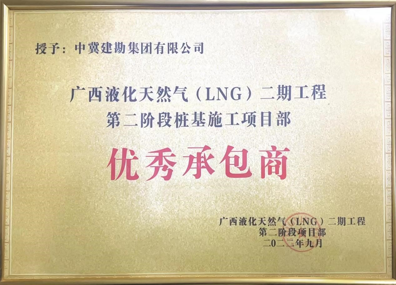廣西液化天然氣LNG項(xiàng)目5#6#儲(chǔ)罐樁基項(xiàng)目是國家管網(wǎng)集團(tuán)北海液化天然氣有限責(zé)任公司非常重視的項(xiàng)目。我公司自2022年04月承接了廣西LNG二期項(xiàng)目儲(chǔ)罐樁基施工,本項(xiàng)目于2022年5月20日開始,7月11日完成。從施工開始,本項(xiàng)目24小時(shí)晝夜不間斷施工,為保障工程高質(zhì)量高效率完成,施工期間,建設(shè)單位、PMC單位、監(jiān)理單位及施工單位配備了充足的管理人員及施工人員,在疫情肆虐,天氣炎熱,雨季臺風(fēng)等一系列困難重重之下,廣西LNG項(xiàng)目部全體員工保持高度的工作熱情,克服一切艱難險(xiǎn)阻,順利完成了樁基施工全部任務(wù)。樁基檢測結(jié)果全部為Ⅰ類樁,保質(zhì)保量的完成了各個(gè)里程碑節(jié)點(diǎn)目標(biāo),榮獲國家管網(wǎng)集團(tuán)北海液化天然氣有限責(zé)任公司廣西北海LNG二期項(xiàng)目部的表揚(yáng)信及優(yōu)秀優(yōu)秀承包商集體榮譽(yù)。