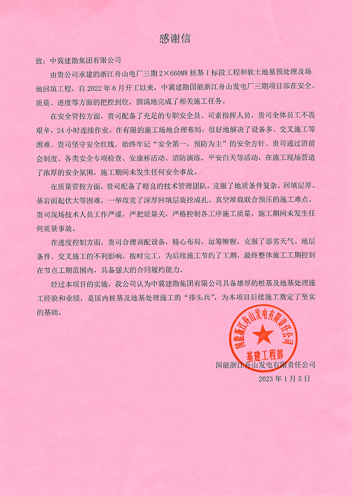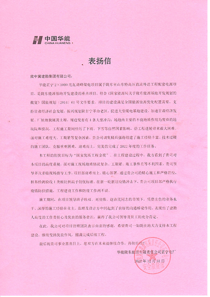 我公司華能甘肅正寧電廠二期工程項(xiàng)目部收到業(yè)主方華能隴東能源公司正寧電廠發(fā)來的表揚(yáng)信,施工期間,在項(xiàng)目領(lǐng)導(dǎo)的帶領(lǐng)下,憑借出色的業(yè)務(wù)水平、深厚的施工經(jīng)驗(yàn)在業(yè)主、監(jiān)理及設(shè)計(jì)方中間起到了良好的溝通橋梁作用。本工程的創(chuàng)優(yōu)目標(biāo)為“國家優(yōu)質(zhì)工程金獎(jiǎng)”,我單位負(fù)責(zé)的B標(biāo)段樁基檢測驗(yàn)收I類樁比例高于創(chuàng)優(yōu)標(biāo)準(zhǔn)。在新一輪新冠疫情沖擊下,項(xiàng)目部嚴(yán)格執(zhí)行疫情防控措施,工程建設(shè)工作和防疫工作兩不誤表現(xiàn)出了建勘人高度的工作責(zé)任心及優(yōu)良的服務(wù)意識,贏得了華能隴東能源公司領(lǐng)導(dǎo)及員工的充分肯定。