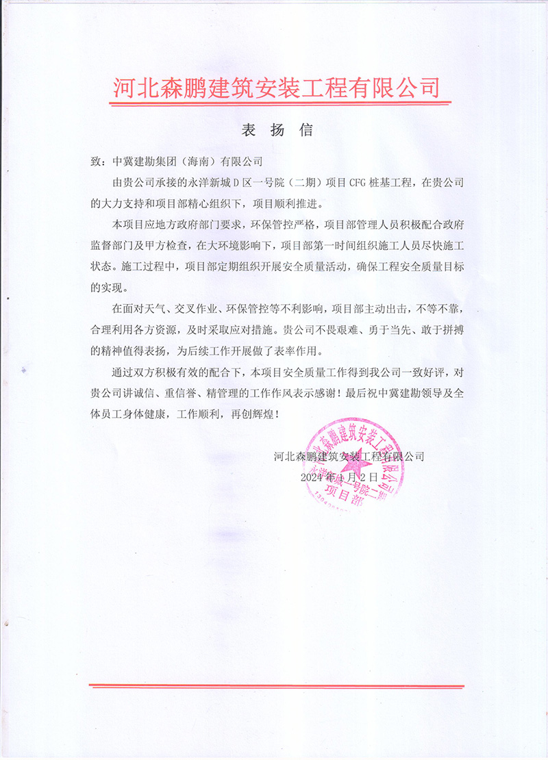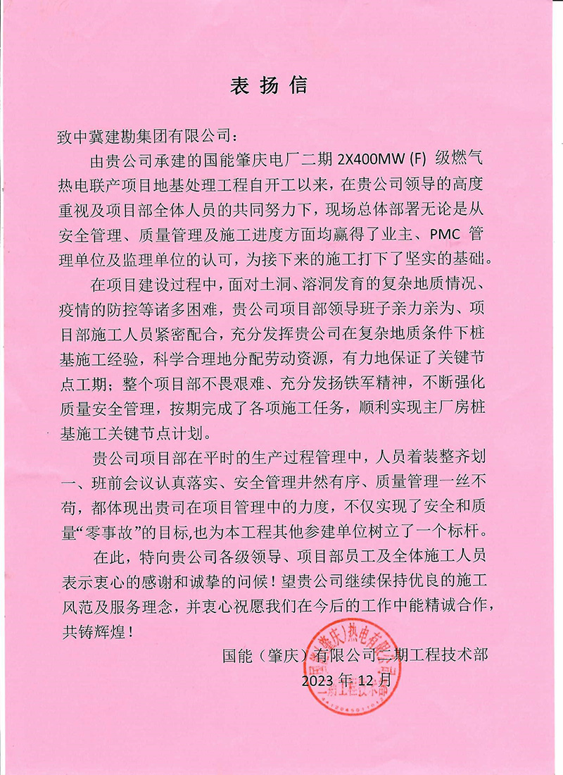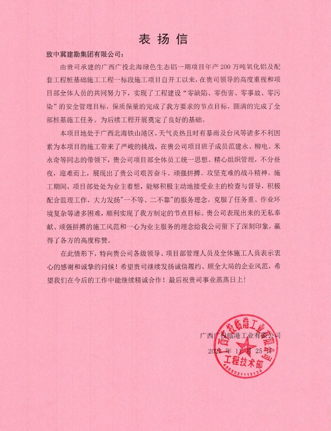 廣西石化煉化項目部接收到大慶石化工程有限公司全密度聚乙烯工程建設部項目經(jīng)理牛家偉發(fā)來的表揚信,信中肯定了我項目部在廣西石化煉化項目樁基工程中所取得的成果。