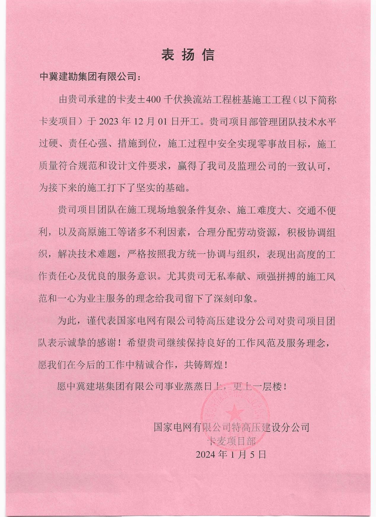 卡麥±400千伏換流站工程樁基施工工程收到業(yè)主國家電網(wǎng)有限公司特高壓建設分公司發(fā)來的表揚信。項目部敢打硬仗的精神面貌,贏得了業(yè)主方的高度贊賞和認可。