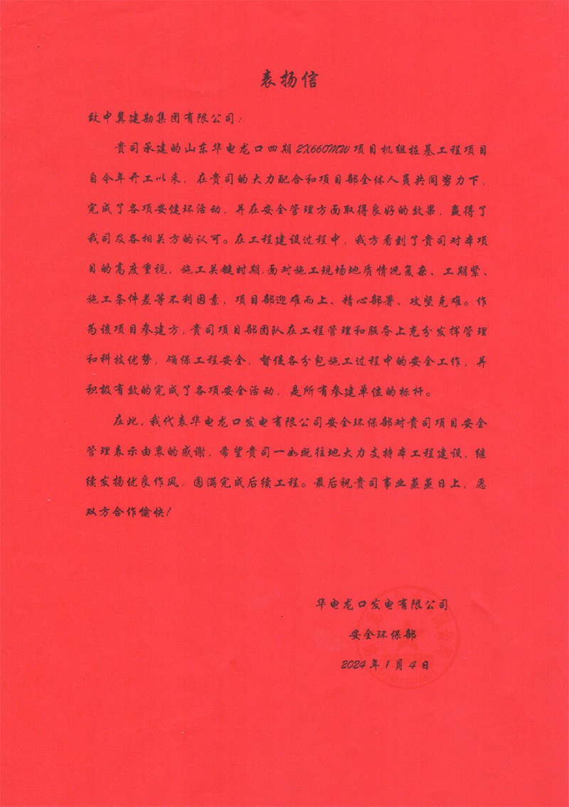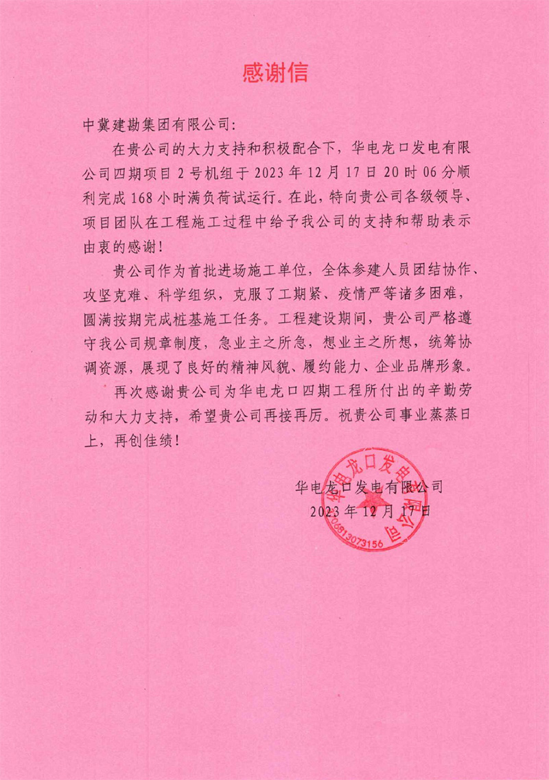 華電龍口發(fā)電有限公司四期項目2號機組于2023年12月17日20時04分順利完成168小時滿負荷試運行。工程建設期間,完成了各項安健環(huán)活動,并在安全管理方面取得良好的效果,贏得了業(yè)主方認可。我公司人員嚴格遵守我公司規(guī)章制度,急業(yè)主之所急,想業(yè)主之所想,統(tǒng)籌協(xié)調資源,展現(xiàn)了良好的精神風貌、履約能力、企業(yè)品牌形象。為此,業(yè)主特向我公司各級領導、項目團隊在工程施工過程中給予的支持和幫助表示由衷感謝。