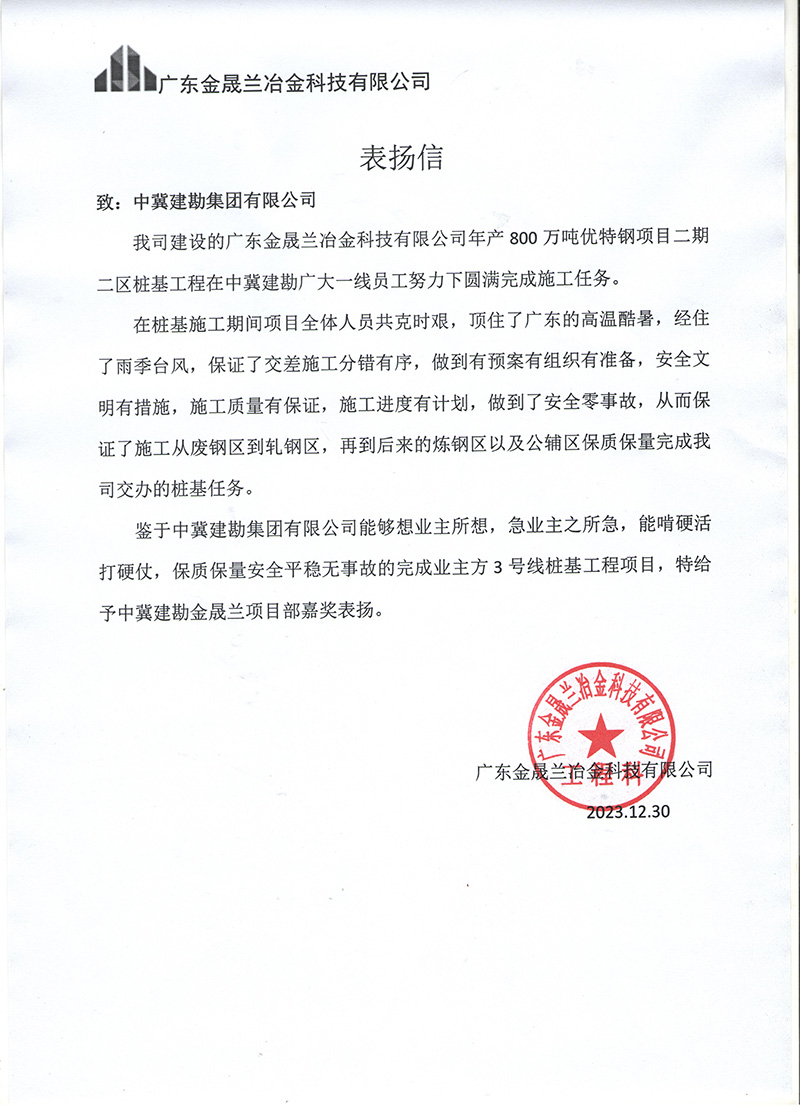 廣東金盛蘭冶金科技有限公司年產(chǎn)800萬噸優(yōu)特鋼項目二期二區(qū)樁基工程,在施工期間項目全體人員共克時艱,頂住了廣東的高溫酷暑,經(jīng)住了雨季臺風,保證了交差施工分錯有序,做到了預案有組織有準備,安全文明有措施,施工質量有保證,施工進度有計劃,做到了安全零事故,保質保量的完成任務,業(yè)主對項目給予嘉獎表揚。