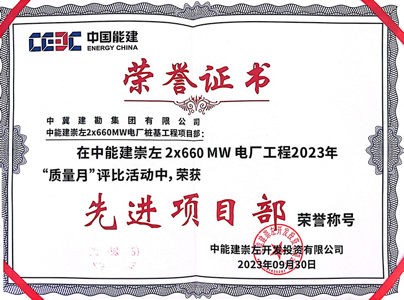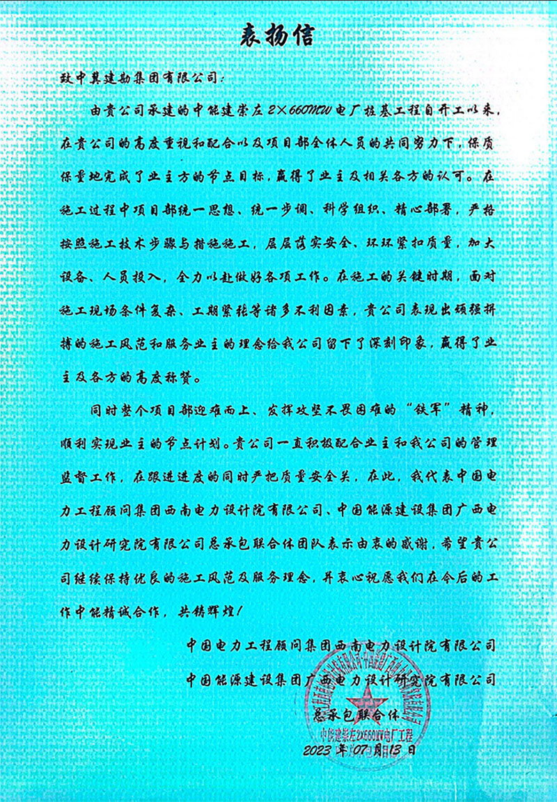 中能建崇左2×660MW電廠樁基工程,在施工過程中,項目部統(tǒng)一思想、統(tǒng)一步調、科學組織,精心部署,嚴格按照施工技術步驟與措施施工,層層落實安全,環(huán)環(huán)緊扣質量,加大設備、人員投入,全力以赴做好各項工作。全體員工以頑強拼搏的施工風范和服務業(yè)主的理念給我公司留下了深刻印象,贏得了業(yè)主及各方的高度稱贊。