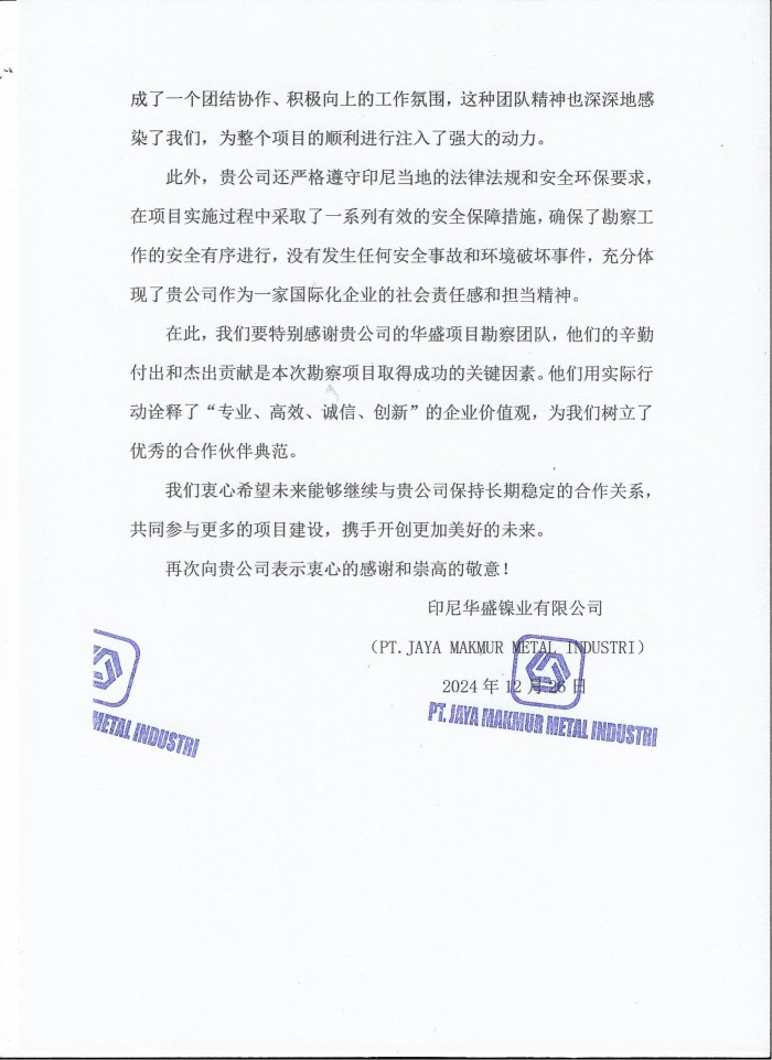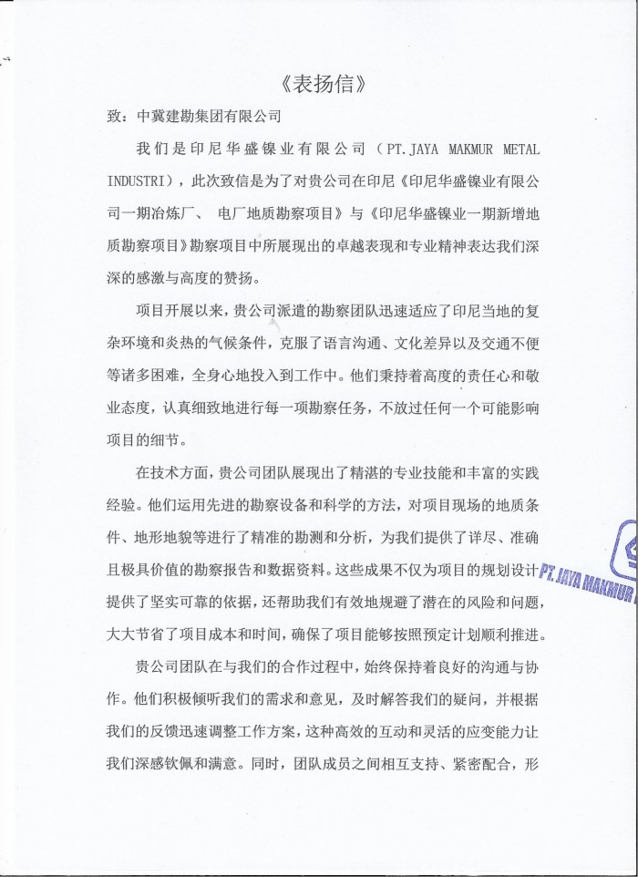 印尼華盛鎳業(yè)有限公司發(fā)來(lái)了表?yè)P(yáng)信。在印尼華盛鎳業(yè)有限公司一期冶煉廠、電廠地質(zhì)勘察項(xiàng)目及印尼華盛-年產(chǎn)200萬(wàn)噸綜合鋼鐵項(xiàng)目的勘察任務(wù)中,印尼華盛勘察項(xiàng)目部全體職工迅速適應(yīng)印尼當(dāng)?shù)氐膹?fù)雜環(huán)境和炎熱的氣候條件,克服了語(yǔ)言溝通、文化差異以及交通不便等諸多困難,全身心地投入到工作中。在項(xiàng)目實(shí)施過(guò)程中,嚴(yán)格遵守印尼當(dāng)?shù)氐姆煞ㄒ?guī)和安全環(huán)保要求,采取了一系列有效的安全保障措施,確保了勘察工作的安全有序進(jìn)行。這種高度的專業(yè)素養(yǎng)和社會(huì)責(zé)任感,贏得了業(yè)主方的高度贊揚(yáng)和深深感激。