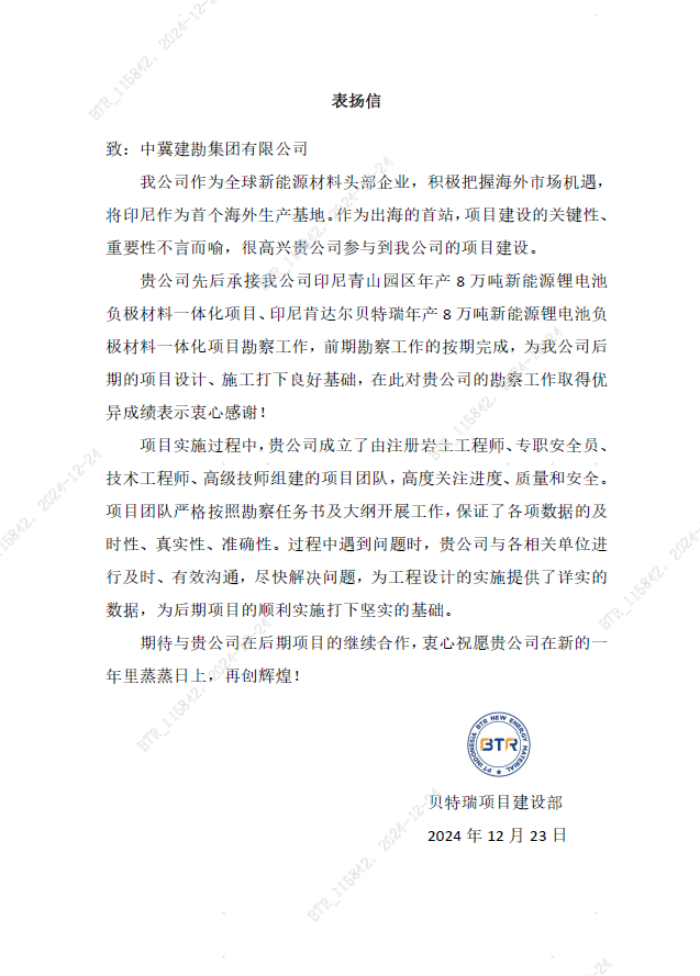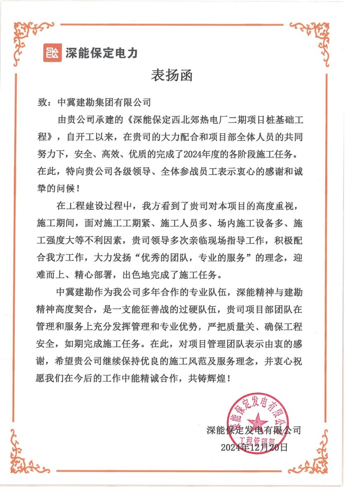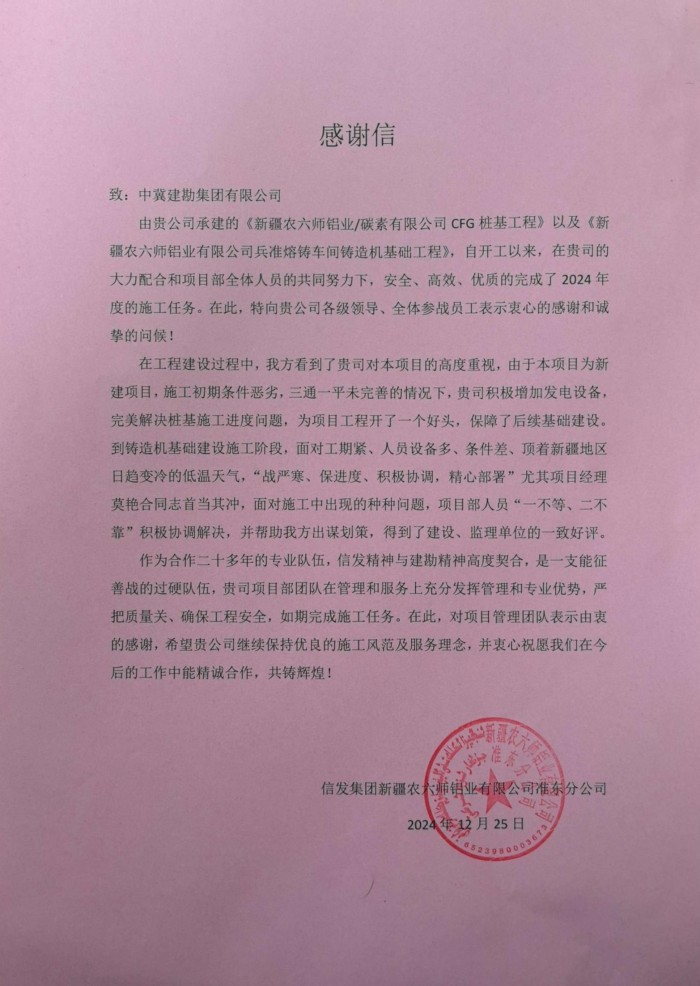 此外,我公司參與的新疆農(nóng)六師鋁業(yè)CFG樁項(xiàng)目、內(nèi)蒙古庫(kù)布齊沙漠鄂爾多斯中北部新能源基地光伏項(xiàng)目、深能保定西北郊熱電廠樁基礎(chǔ)工程等多個(gè)國(guó)內(nèi)外項(xiàng)目收到業(yè)主單位表?yè)P(yáng)信,對(duì)我公司在項(xiàng)目中的高效執(zhí)行、嚴(yán)謹(jǐn)管理和出色的團(tuán)隊(duì)協(xié)作表示衷心感謝,并希望未來(lái)繼續(xù)與我公司保持緊密合作。