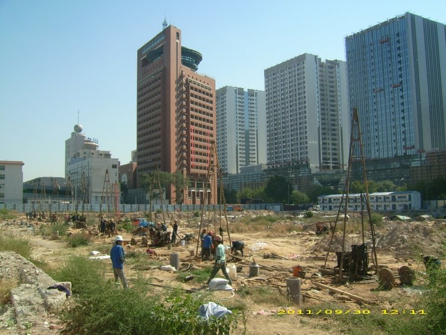 擬建場地基巖面起伏較大,巖溶地質(zhì)條件復(fù)雜,基巖內(nèi)溶洞、裂隙發(fā)育。溶洞最大高度為9.7m,對勘察揭露的空洞、半充填溶洞及破碎帶采用先充填粗骨料后注漿治理方法;對嵌巖樁采用“一樁一探、探治結(jié)合”;根據(jù)巖溶治理方案專家論證評審意見,對對原古采煤巷道采用鉆探與物探相結(jié)合的方法。利用鉆探孔直接在巷道平面位置及周邊進行巷道探查,利用井下電視、井間CT、淺層地震和瞬變電磁物探手段進行驗證,同時對遠(yuǎn)年采空區(qū)進行了探查驗證并進行了治理。2012年4月22日,專家評審驗收意見為:提供的巖溶地基治理竣工資料齊全、內(nèi)容較全面,滿足巖溶地基治理工程竣工驗收評審要求;檢測單位采用了鉆探及面波等檢測方法可靠;巖溶地基治理效果達到了設(shè)計要求,同意通過竣工驗收評審。