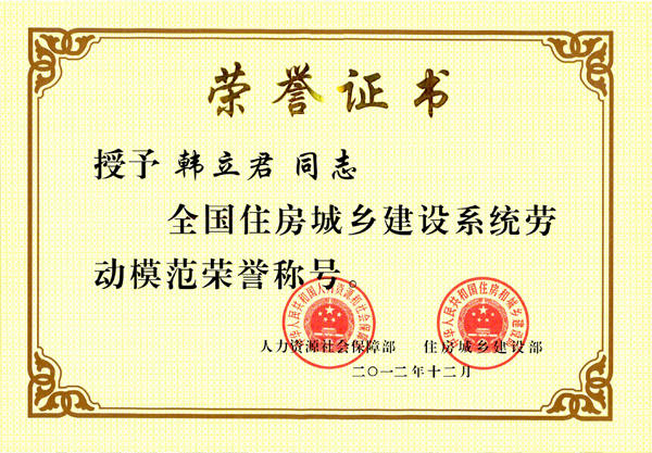 為進(jìn)一步激勵全國住房城鄉(xiāng)建設(shè)系統(tǒng)廣大干部職工的積極性、主動性、創(chuàng)造性,促進(jìn)住房城鄉(xiāng)建設(shè)事業(yè)健康持續(xù)發(fā)展,人力資源和社會保障部、住房和城鄉(xiāng)建設(shè)部在全國住房城鄉(xiāng)建設(shè)系統(tǒng)內(nèi),開展了先進(jìn)集體和先進(jìn)個人的評選活動。經(jīng)過公司及各級人力資源社會保障部門、住房城鄉(xiāng)建設(shè)管理部門的逐級推薦,報評選表彰工作領(lǐng)導(dǎo)小組審查通過后,最后由住房城鄉(xiāng)建設(shè)部黨組和人力資源社會保障部審定,評選出先進(jìn)集體200個,先進(jìn)工作者450名,勞動模范350名。其中,我公司董事長韓立君同志榮獲全國住房城鄉(xiāng)建設(shè)系統(tǒng)勞動模范稱號。