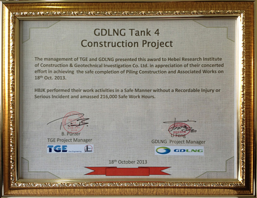 廣東大鵬LNG工程自2013年4月18日開工,至2013年9月4日完成樁基施工,10月份完成包括鑿樁頭在內(nèi)的所有現(xiàn)場施工任務(wù)。在此期間,項(xiàng)目部全體成員一直堅(jiān)持安全第一的理念,嚴(yán)格按照總包、業(yè)主的安全文明施工要求穩(wěn)步推進(jìn)工作,得到了總包、監(jiān)理、業(yè)主的一致好評,工程結(jié)束后總包TGE為我公司頒發(fā)了安全文明施工獎狀。